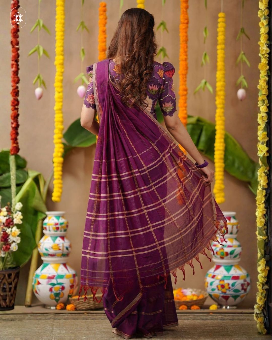 Crafted from pure handloom silk, this ensemble celebrates Indian craftsmanship with its Pattu border detailing and intricate handwork. The lotus motifs on the blouse add a divine charm, while the Narthaki motif on the back reflects cultural grace and artistic heritage. The sweetheart neckline and elbow-length sleeves lend it a touch of elegance and femininity.