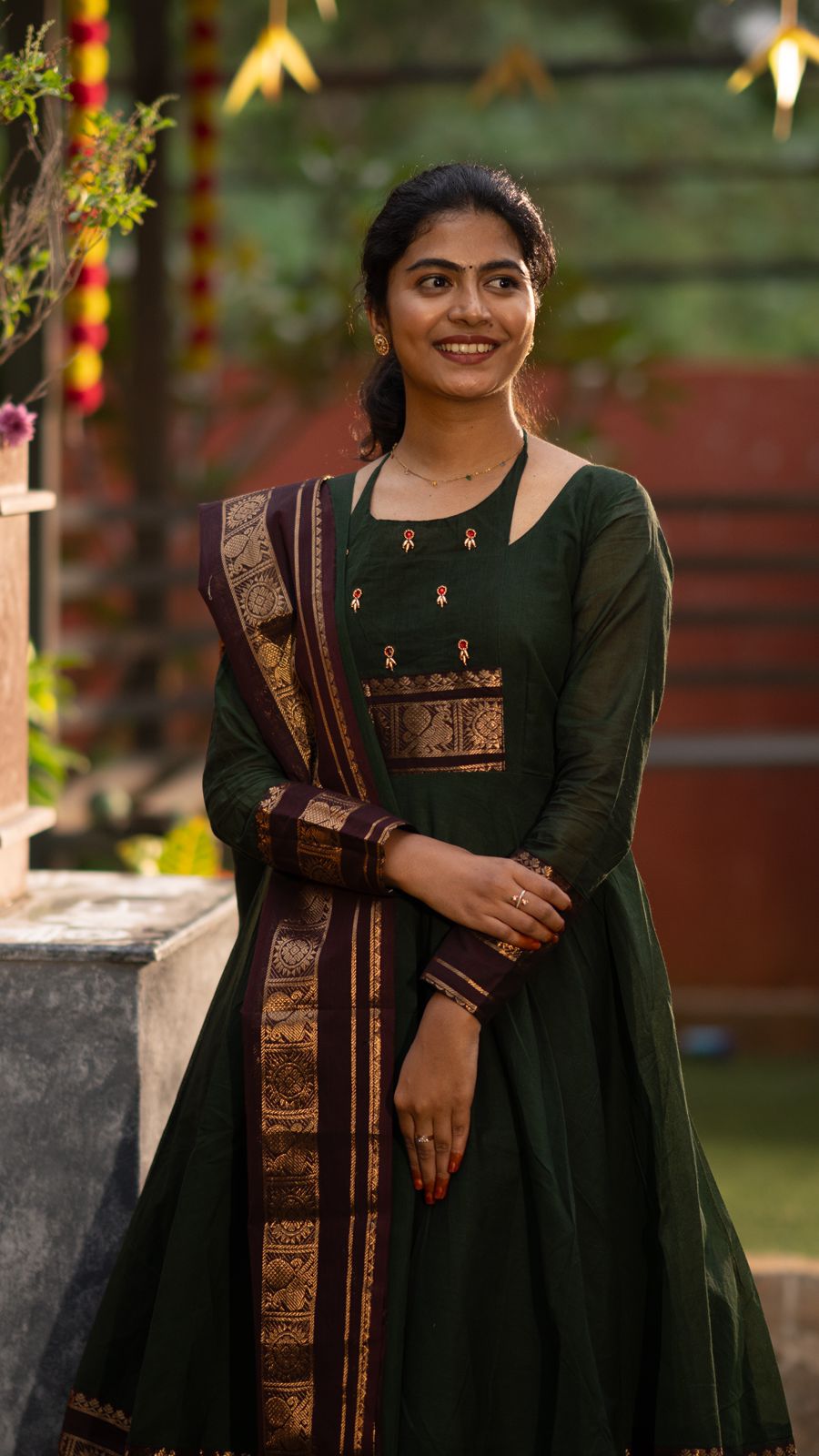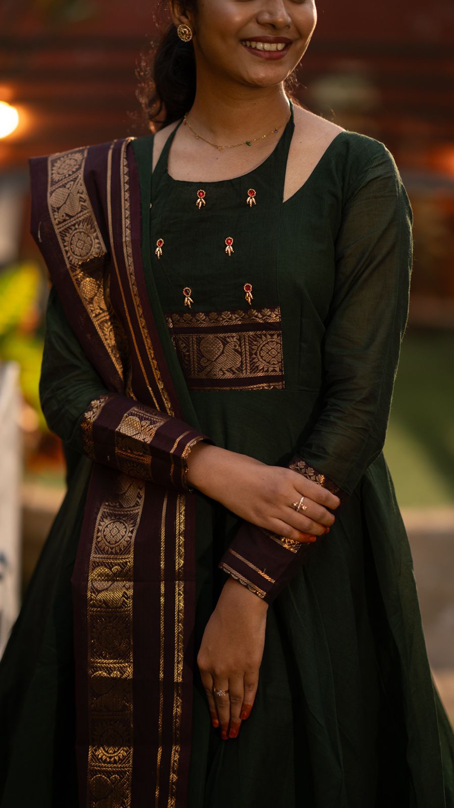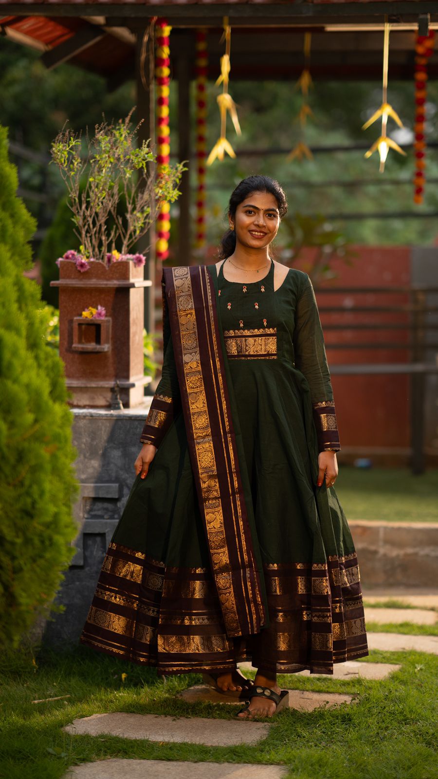 The soothing green shade reflects tradition and prosperity, making it a perfect choice for festivals, poojas, weddings, and special occasions. Its flattering flare adds movement and elegance, ensuring a stunning look with every step.