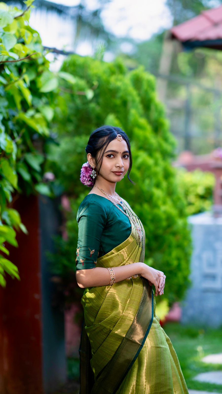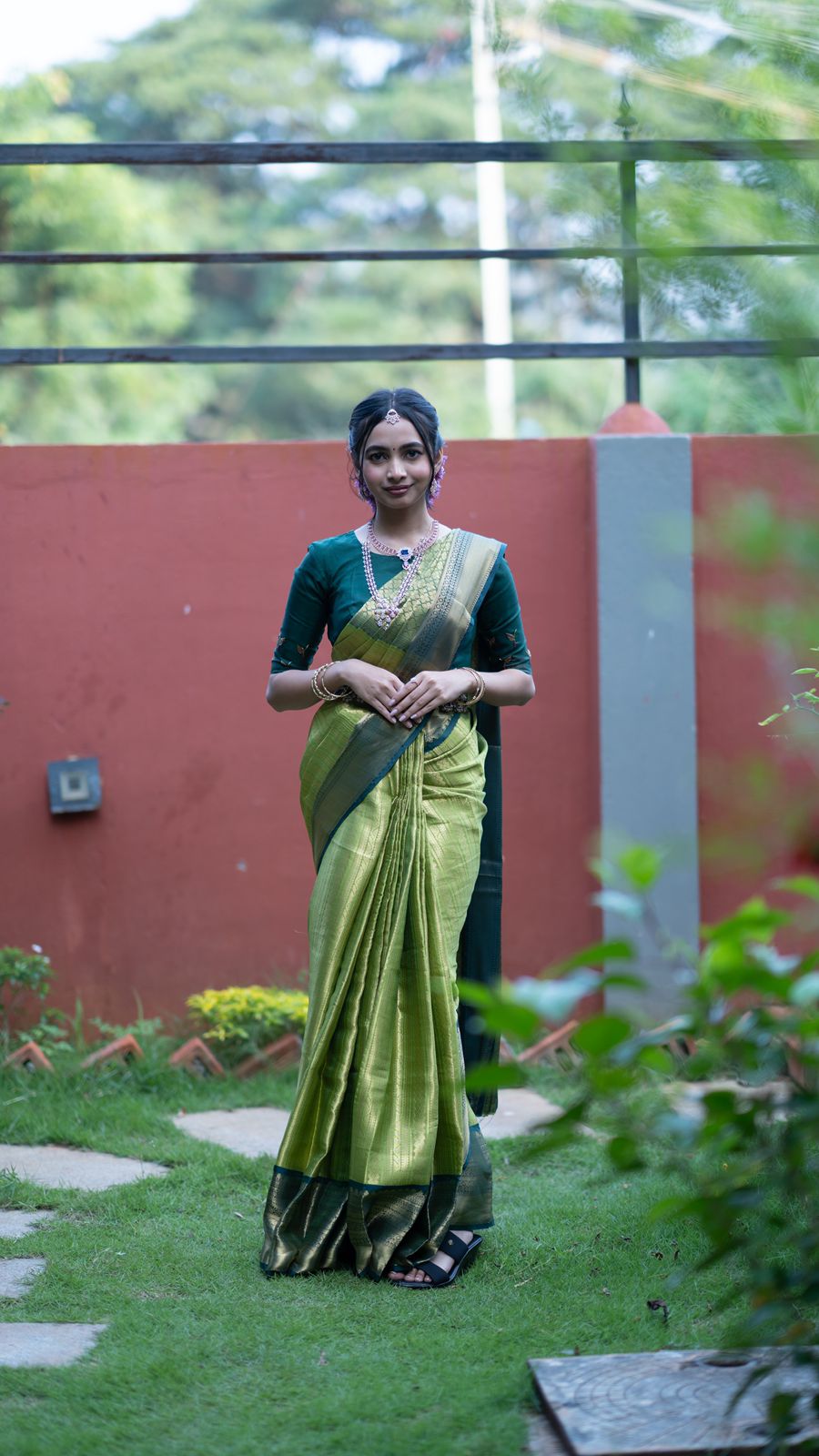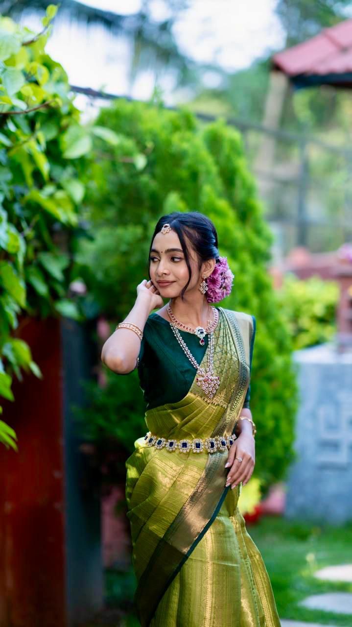 Radiating timeless elegance in this beautiful Thai saree, woven in rich green and gold hues. The subtle sheen of the fabric paired with a deep green blouse creates a perfect balance of tradition and sophistication. Finished with minimal jewelry and soft makeup, this look celebrates grace, culture, and understated luxury.