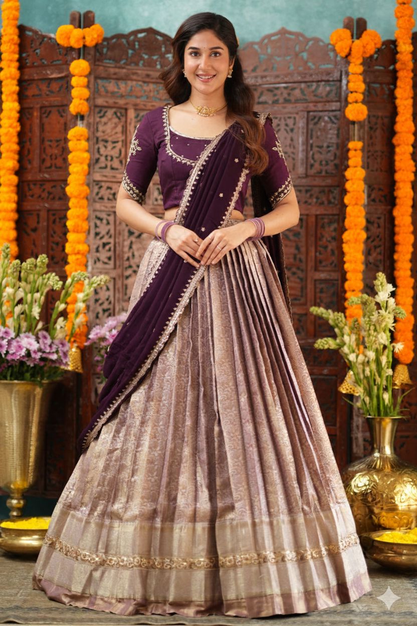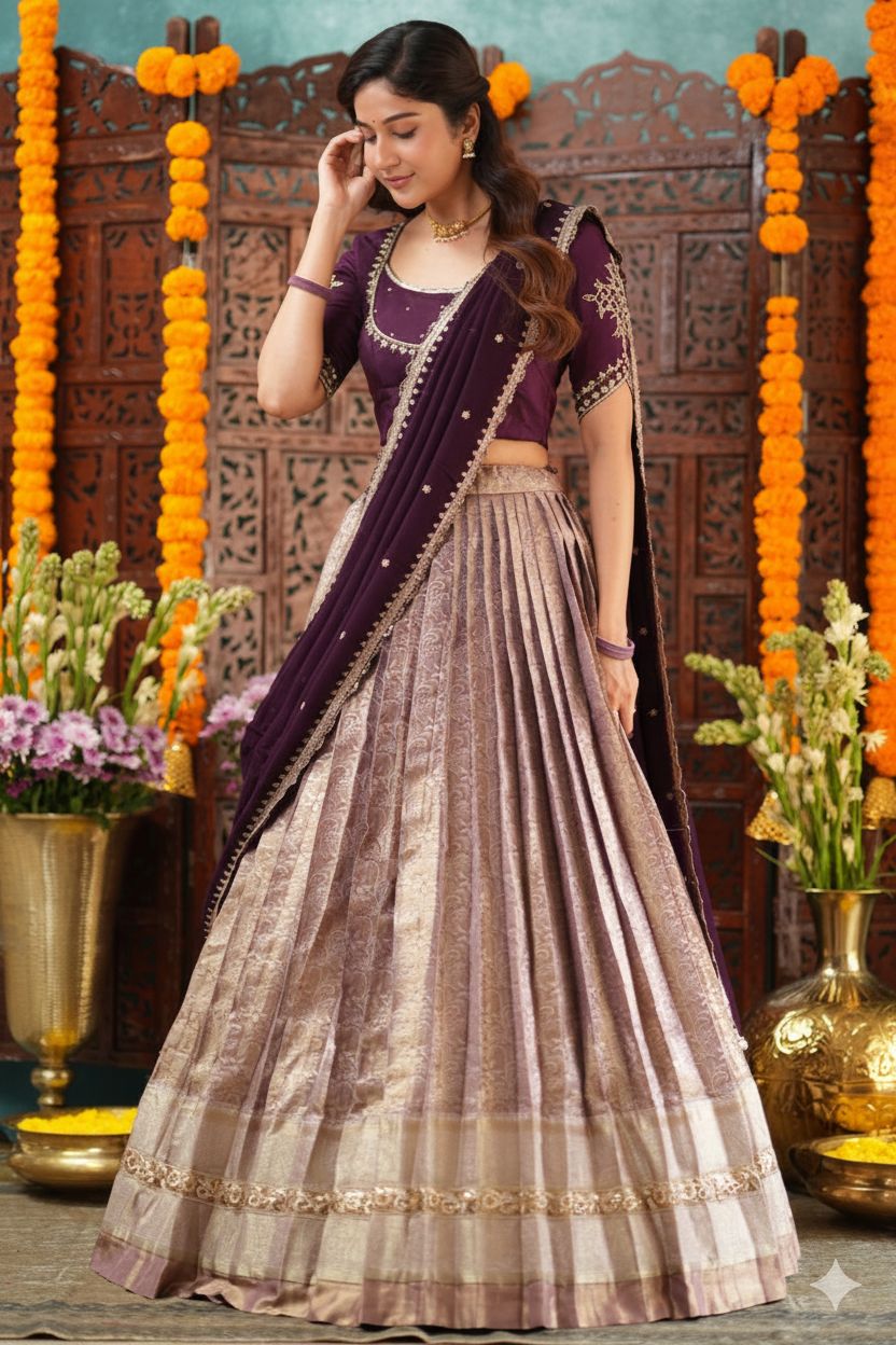 Celebrity Look: Inspired by celebrity festive styling, this lehenga pairs rich jewel tones with a graceful A-line silhouette. Subtle embroidery and a saree-style dupatta drape create an elegant, timeless celebration look