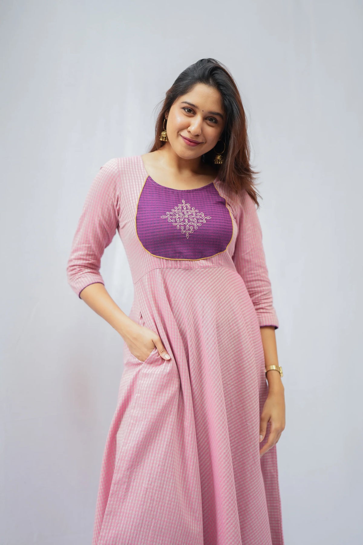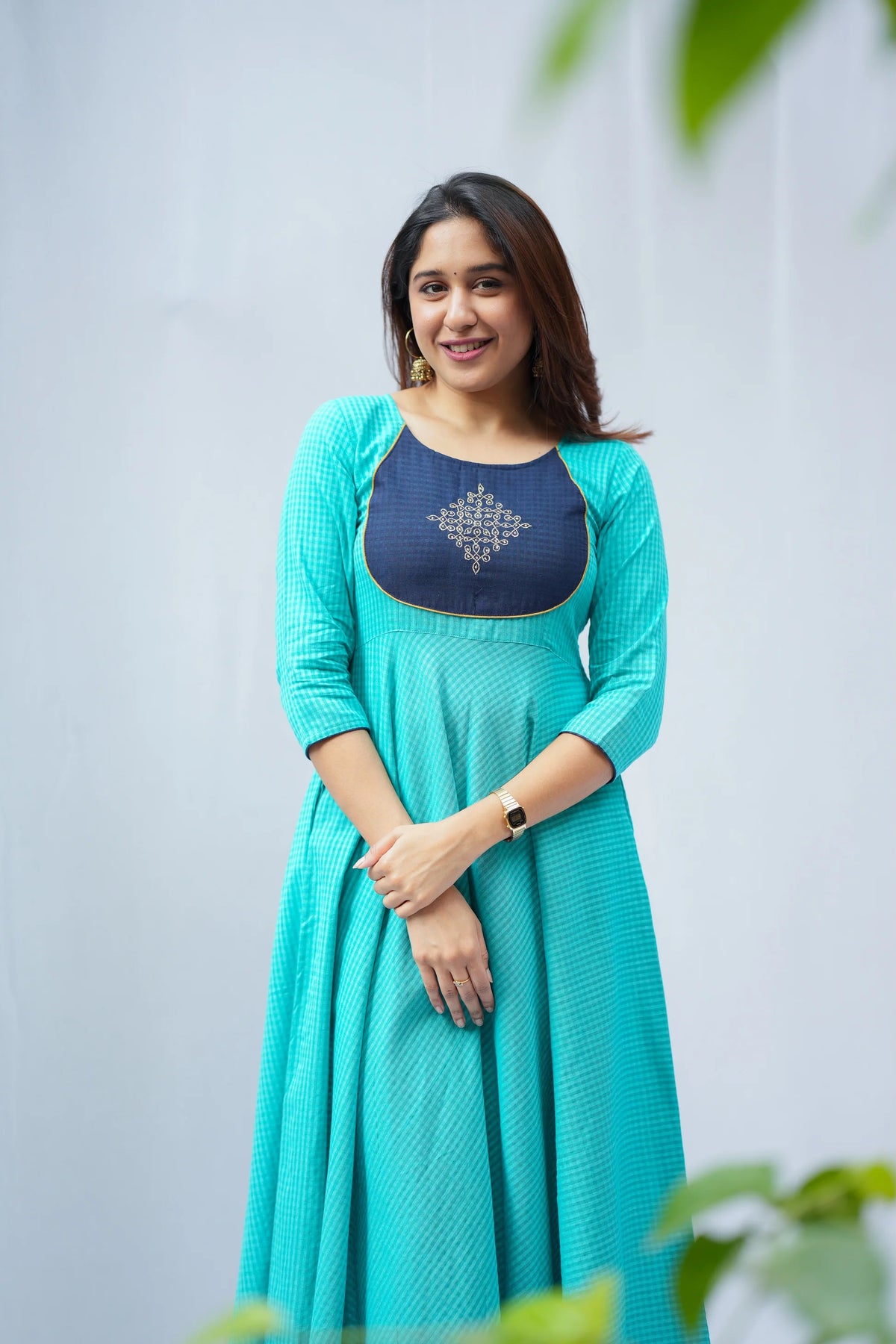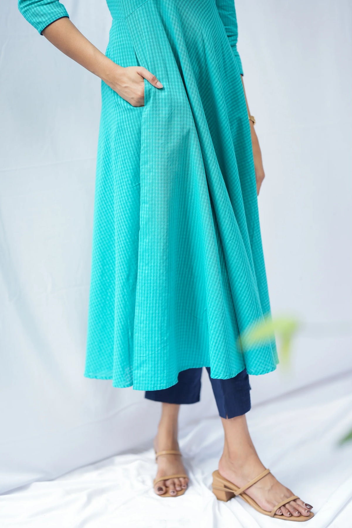 A beautiful teal anarkali kurta featuring delicate self-checks and stunning golden kolam embroidery. The navy blue contrast patch brings a fresh twist to this classic silhouette, while the matching pants create a perfectly coordinated look. A thoughtfully crafted ethnic outfit that makes a graceful statement.