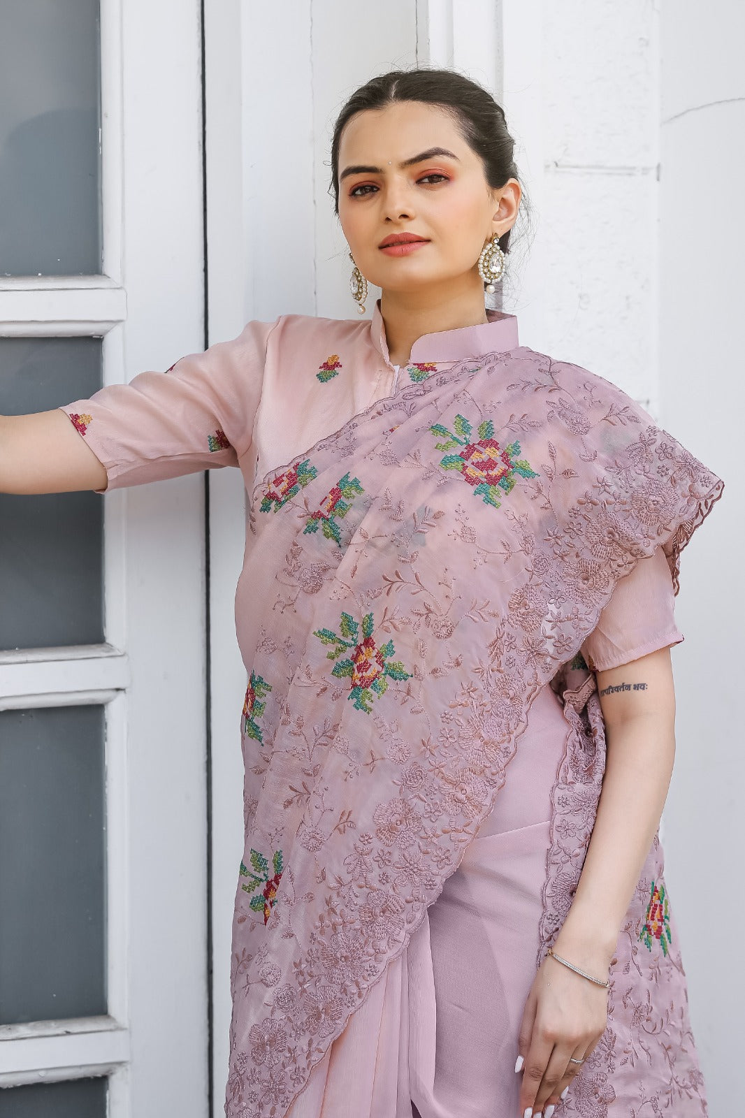 Pure Shiny Zari Chiffon Saree With Beautiful Work All Over Saree With Cutowork And Embroidory Cross Stich Flower Work All Over Saree Teamed With All Over Buttis Blouse